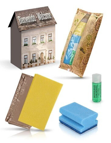 KIT DE BIENVENIDA EN CASA DE CARTON CON BOLSA BIODEGRADABLE CERTIFICADA PARA APARTAMENTOS TURISTICOS