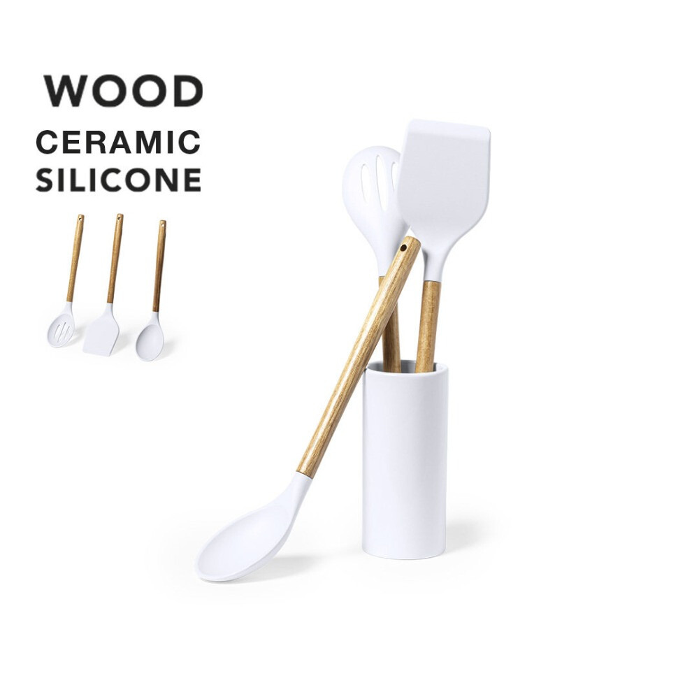 Set de cocina de 3 piezas, con mango fabricado en madera de acacia natural y accesorios en silicona. Incluye cuchara, paleta y espumadera, con base de cerámica a juego. Presentación en caja individual de diseño kraft.