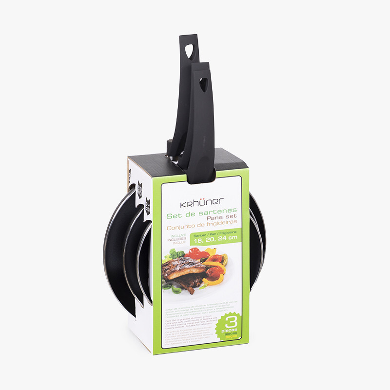Set de 3 sartenes aluminio prensado Krhüner 18/20/24cm. Descubre la solución perfecta para tu cocina con este set de sartenes de aluminio prensado de alta calidad. Cada sartén cuenta con un grosor de 2,5 mm y un mango ergonómico de baquelita, diseñado para ofrecer comodidad y seguridad.