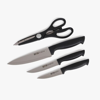 Organiza y equipa tu cocina con el elegante Set Quittin Nero, compuesto por cuchillos esenciales, tijeras y una tacoma de diseño moderno en color negro.