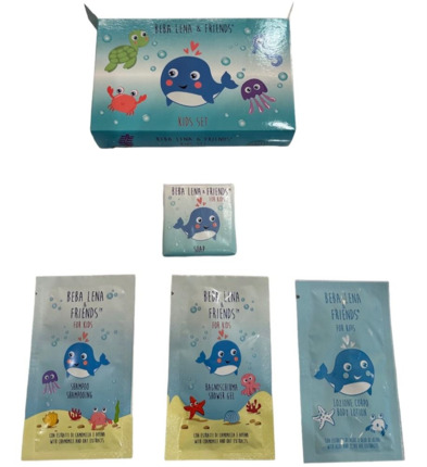 50 Unidades/pacote Preço/unidade: 1,0000€KIT INFANTIL CON JABONCITO, CHAMPÚ, GEL DE BAÑO Y LOCION CORPORAL EN CAJITA INFANTIL BEBA LENA & FRIENDS