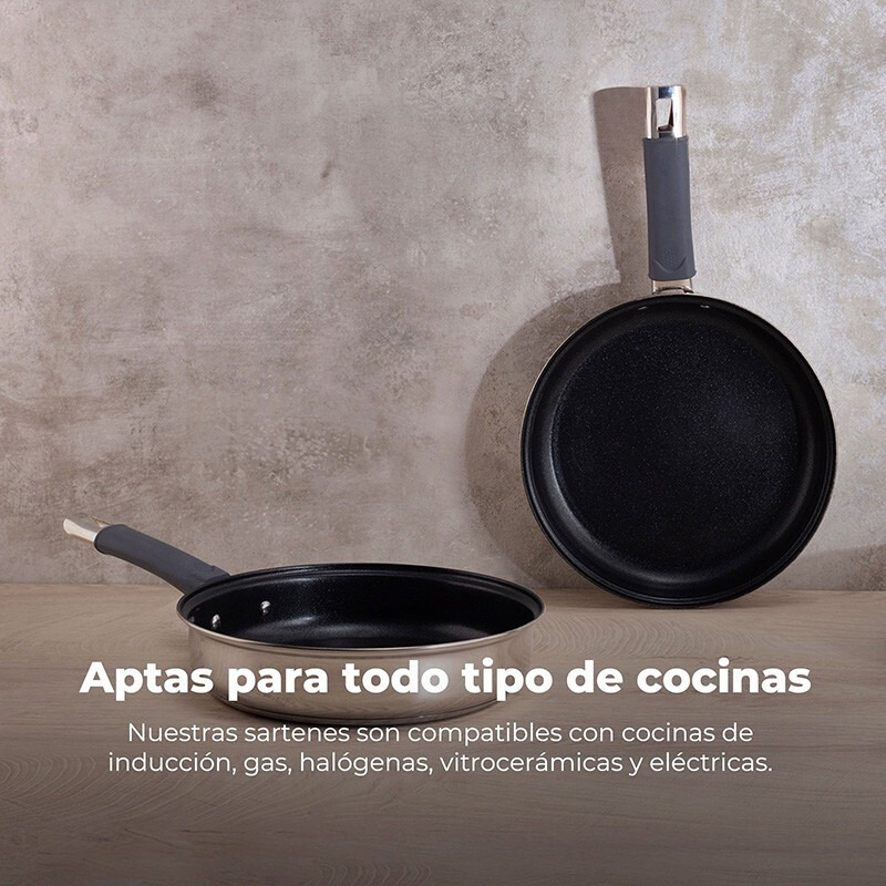 Cuentan con mangos de silicona ergonómicos que ofrecen un agarre cómodo y seguro, incluso durante un uso prolongado. Su base es apta para todo tipo de cocinas, incluida inducción, asegurando una distribución homogénea del calor para una cocción uniforme en cada preparación.