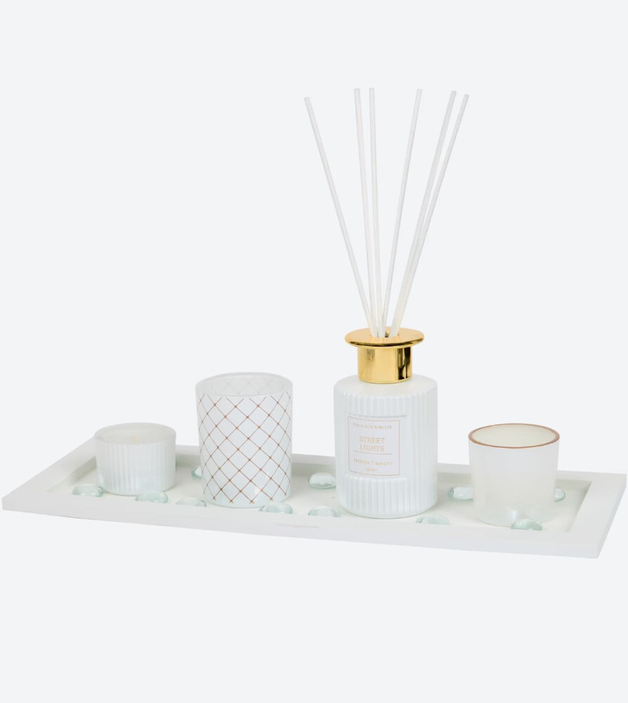 - Contiene un difusor de aroma, porta velas, velas de té y una bandeja