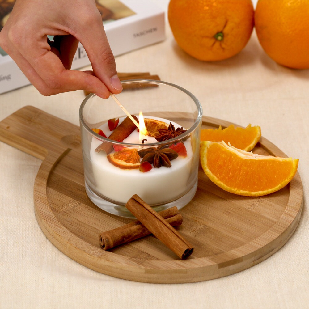 Vela aromática elaborada con cera vegetal y aroma de canela y cítricos.